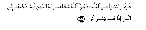 65. Fa-itha rakiboo fee alfulki daAAawoo Allaha mukhliseena lahu alddeena falamma najjahum ila albarri itha hum yushrikoona