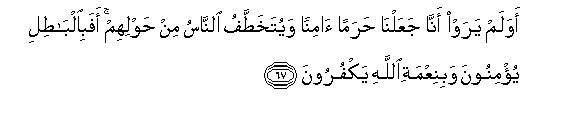 67. Awa lam yaraw anna jaAAalna haraman aminan wayutakhattafu alnnasu min hawlihim afabialbatili yu/minoona wabiniAAmati Allahi yakfuroona