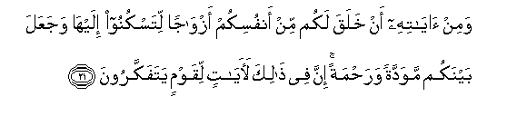 21. Wamin ayatihi an khalaqa lakum min anfusikum azwajan litaskunoo ilayha wajaAAala baynakum mawaddatan warahmatan inna fee thalika laayatin liqawmin yatafakkaroona