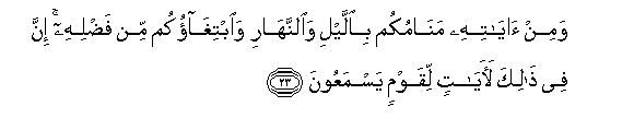 23. Wamin ayatihi manamukum biallayli waalnnahari waibtighaokum min fadlihi inna fee thalika laayatin liqawmin yasmaAAoona