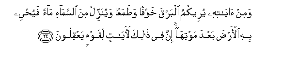 24. Wamin ayatihi yureekumu albarqa khawfan watamaAAan wayunazzilu mina alssama-i maan fayuhyee bihi al-arda baAAda mawtiha inna fee thalika laayatin liqawmin yaAAqiloona