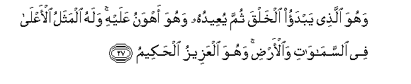 27. Wahuwa allathee yabdao alkhalqa thumma yuAAeeduhu wahuwa ahwanu AAalayhi walahu almathalu al-aAAla fee alssamawati waal-ardi wahuwa alAAazeezu alhakeemu