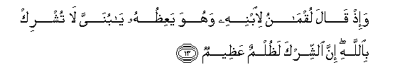13. Wa-ith qala luqmanu liibnihi wahuwa yaAAithuhu ya bunayya la tushrik biAllahi inna alshshirka lathulmun AAatheemun