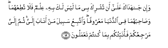 15. Wa-in jahadaka AAala an tushrika bee ma laysa laka bihi AAilmun fala tutiAAhuma wasahibhuma fee alddunya maAAroofan waittabiAA sabeela man anaba ilayya thumma ilayya marjiAAukum faonabbi-okum bima kuntum taAAmaloona