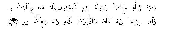 17. Ya bunayya aqimi alssalata wa/mur bialmaAAroofi wainha AAani almunkari waisbir AAala ma asabaka inna thalika min AAazmi al-omoori