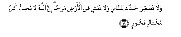 18. Wala tusaAAAAir khaddaka lilnnasi wala tamshi fee al-ardi marahan inna Allaha la yuhibbu kulla mukhtalin fakhoorin