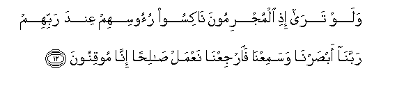 12. Walaw tara ithi almujrimoona nakisoo ruoosihim AAinda rabbihim rabbana absarna wasamiAAna faarjiAAna naAAmal salihan inna mooqinoona