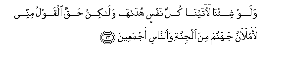 13. Walaw shi-na laatayna kulla nafsin hudaha walakin haqqa alqawlu minnee laamlaanna jahannama mina aljinnati waalnnasi ajmaAAeena