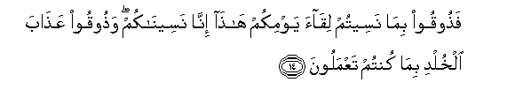 14. Fathooqoo bima naseetum liqaa yawmikum hatha inna naseenakum wathooqoo AAathaba alkhuldi bima kuntum taAAmaloona