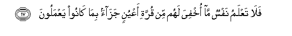 17. Fala taAAlamu nafsun ma okhfiya lahum min qurrati aAAyunin jazaan bima kanoo yaAAmaloona