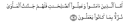 19. Amma allatheena amanoo waAAamiloo alssalihati falahum jannatu alma/wa nuzulan bima kanoo yaAAmaloona