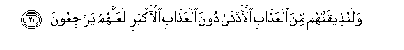 21. Walanutheeqannahum mina alAAathabi al-adna doona alAAathabi al-akbari laAAallahum yarjiAAoona