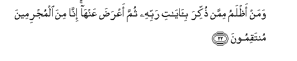 22. Waman athlamu mimman thukkira bi-ayati rabbihi thumma aAArada AAanha inna mina almujrimeena muntaqimoona
