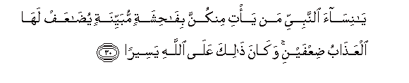 30. Ya nisaa alnnabiyyi man ya/ti minkunna bifahishatin mubayyinatin yudaAAaf laha alAAathabu diAAfayni wakana thalika AAala Allahi yaseeran