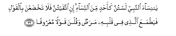 32. Ya nisaa alnnabiyyi lastunna kaahadin mina alnnisa-i ini ittaqaytunna fala takhdaAAna bialqawli fayatmaAAa allathee fee qalbihi maradun waqulna qawlan maAAroofan