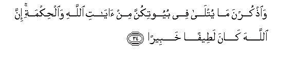 34. Waothkurna ma yutla fee buyootikunna min ayati Allahi waalhikmati inna Allaha kana lateefan khabeeran