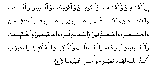 35. Inna almuslimeena waalmuslimati waalmu/mineena waalmu/minati waalqaniteena waalqanitati waalssadiqeena waalssadiqati waalssabireena waalssabirati waalkhashiAAeena waalkhashiAAati waalmutasaddiqeena waalmutasaddiqati waalssa-imeena waalssa-imati waalhafitheena furoojahum waalhafithati waalththakireena Allaha katheeran waalththakirati aAAadda Allahu lahum maghfiratan waajran AAatheeman