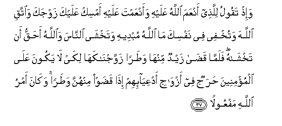37. Wa-ith taqoolu lillathee anAAama Allahu AAalayhi waanAAamta AAalayhi amsik AAalayka zawjaka waittaqi Allaha watukhfee fee nafsika ma Allahu mubdeehi watakhsha alnnasa waAllahu ahaqqu an takhshahu falamma qada zaydun minha wataran zawwajnakaha likay la yakoona AAala almu/mineena harajun fee azwaji adAAiya-ihim itha qadaw minhunna wataran wakana amru Allahi mafAAoolan
