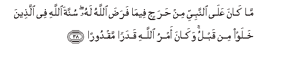 38. Ma kana AAala alnnabiyyi min harajin feema farada Allahu lahu sunnata Allahi fee allatheena khalaw min qablu wakana amru Allahi qadaran maqdooran