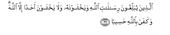 39. Allatheena yuballighoona risalati Allahi wayakhshawnahu wala yakhshawna ahadan illa Allaha wakafa biAllahi haseeban