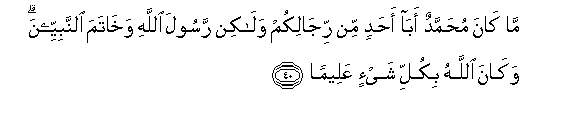 40. Ma kana muhammadun aba ahadin min rijalikum walakin rasoola Allahi wakhatama alnnabiyyeena wakana Allahu bikulli shay-in AAaleeman