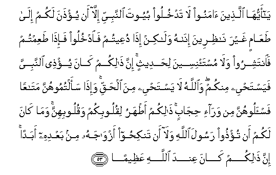 53. Ya ayyuha allatheena amanoo la tadkhuloo buyoota alnnabiyyi illa an yu/thana lakum ila taAAamin ghayra nathireena inahu walakin itha duAAeetum faodkhuloo fa-itha taAAimtum faintashiroo wala musta/niseena lihadeethin inna thalikum kana yu/thee alnnabiyya fayastahyee minkum waAllahu la yastahyee mina alhaqqi wa-itha saaltumoohunna mataAAan fais-aloohunna min wara-i hijabin thalikum atharu liquloobikum waquloobihinna wama kana lakum an tu/thoo rasoola Allahi wala an tankihoo azwajahu min baAAdihi abadan inna thalikum kana AAinda Allahi AAatheeman