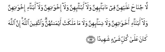 55. La junaha AAalayhinna fee aba-ihinna wala abna-ihinna wala ikhwanihinna wala abna-i ikhwanihinna wala abna-i akhawatihinna wala nisa-ihinna wala ma malakat aymanuhunna waittaqeena Allaha inna Allaha kana AAala kulli shay-in shaheedan