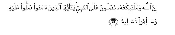 56. Inna Allaha wamala-ikatahu yusalloona AAala alnnabiyyi ya ayyuha allatheena amanoo salloo AAalayhi wasallimoo tasleeman