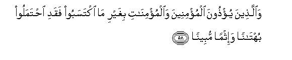 58. Waallatheena yu/thoona almu/mineena waalmu/minati bighayri ma iktasaboo faqadi ihtamaloo buhtanan wa-ithman mubeenan