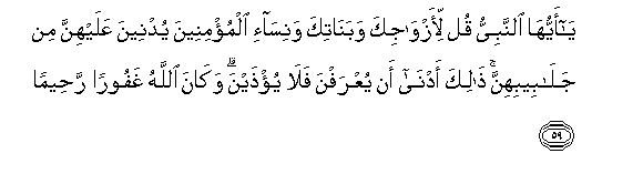 59. Ya ayyuha alnnabiyyu qul li-azwajika wabanatika wanisa-i almu/mineena yudneena AAalayhinna min jalabeebihinna thalika adna an yuAArafna fala yu/thayna wakana Allahu ghafooran raheeman