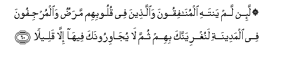 60. La-in lam yantahi almunafiqoona waallatheena fee quloobihim maradun waalmurjifoona fee almadeenati lanughriyannaka bihim thumma la yujawiroonaka feeha illa qaleelan