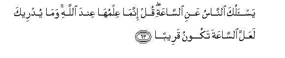 63. Yas-aluka alnnasu AAani alssaAAati qul innama AAilmuha AAinda Allahi wama yudreeka laAAalla alssaAAata takoonu qareeban