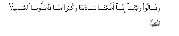 67. Waqaloo rabbana inna ataAAna sadatana wakubaraana faadalloona alssabeela