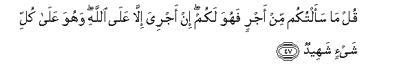 47. Qul ma saaltukum min ajrin fahuwa lakum in ajriya illa AAala Allahi wahuwa AAala kulli shay-in shaheedun