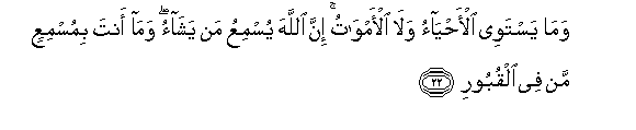 22. Wama yastawee al-ahyao wala al-amwatu inna Allaha yusmiAAu man yashao wama anta bimusmiAAin man fee alquboori