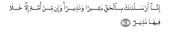 24. Inna arsalnaka bialhaqqi basheeran wanatheeran wa-in min ommatin illa khala feeha natheerun
