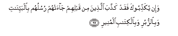 25. Wa-in yukaththibooka faqad kaththaba allatheena min qablihim jaat-hum rusuluhum bialbayyinati wabialzzuburi wabialkitabi almuneeri