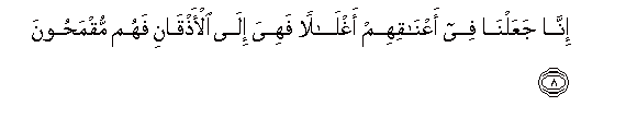 8. Inna jaAAalna fee aAAnaqihim aghlalan fahiya ila al-athqani fahum muqmahoona