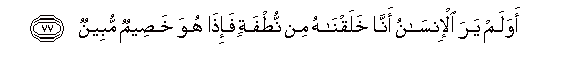 77. Awa lam yara al-insanu anna khalaqnahu min nutfatin fa-itha huwa khaseemun mubeenun