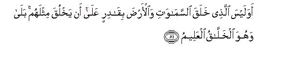 81. "Is not He Who created the heavens and the earth able to create the like thereof?" - Yea, indeed! for He is the Creator Supreme, of skill and knowledge (infinite)!