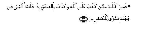 32. Faman athlamu mimman kathaba AAala Allahi wakaththaba bialssidqi ith jaahu alaysa fee jahannama mathwan lilkafireena