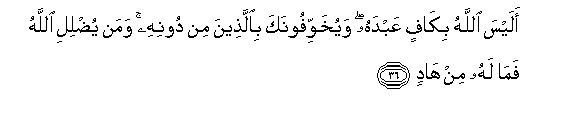 36. Is not Allah enough for his Servant? But they try to frighten thee with other (gods) besides Him! for such as Allah leaves to stray, there can be no guide.