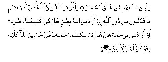 38. Wala-in saaltahum man khalaqa alssamawati waal-arda layaqoolunna Allahu qul afaraaytum ma tadAAoona min dooni Allahi in aradaniya Allahu bidurrin hal hunna kashifatu durrihi aw aradanee birahmatin hal hunna mumsikatu rahmatihi qul hasbiya Allahu AAalayhi yatawakkalu almutawakkiloona