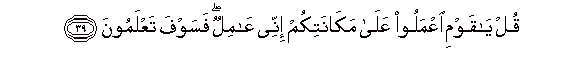 39. Qul ya qawmi iAAmaloo AAala makanatikum innee AAamilun fasawfa taAAlamoona