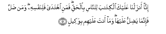 41. Inna anzalna AAalayka alkitaba lilnnasi bialhaqqi famani ihtada falinafsihi waman dalla fa-innama yadillu AAalayha wama anta AAalayhim biwakeelin