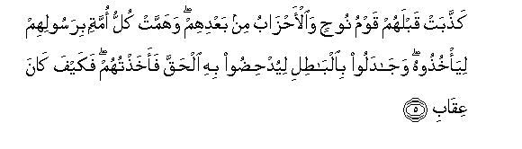 5. Kaththabat qablahum qawmu noohin waal-ahzabu min baAAdihim wahammat kullu ommatin birasoolihim liya/khuthoohu wajadaloo bialbatili liyudhidoo bihi alhaqqa faakhathtuhum fakayfa kana AAiqabi