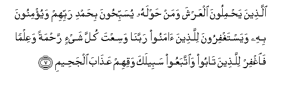 7. Allatheena yahmiloona alAAarsha waman hawlahu yusabbihoona bihamdi rabbihim wayu/minoona bihi wayastaghfiroona lillatheena amanoo rabbana wasiAAta kulla shay-in rahmatan waAAilman faighfir lillatheena taboo waittabaAAoo sabeelaka waqihim AAathaba aljaheemi
