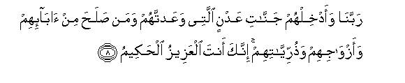 8. Rabbana waadkhilhum jannati AAadnin allatee waAAadtahum waman salaha min aba-ihim waazwajihim wathurriyyatihim innaka anta alAAazeezu alhakeemu