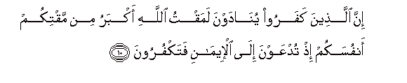 10. Inna allatheena kafaroo yunadawna lamaqtu Allahi akbaru min maqtikum anfusakum ith tudAAawna ila al-eemani fatakfuroona