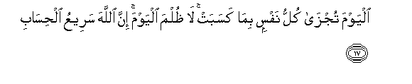 17. Alyawma tujza kullu nafsin bima kasabat la thulma alyawma inna Allaha sareeAAu alhisabi